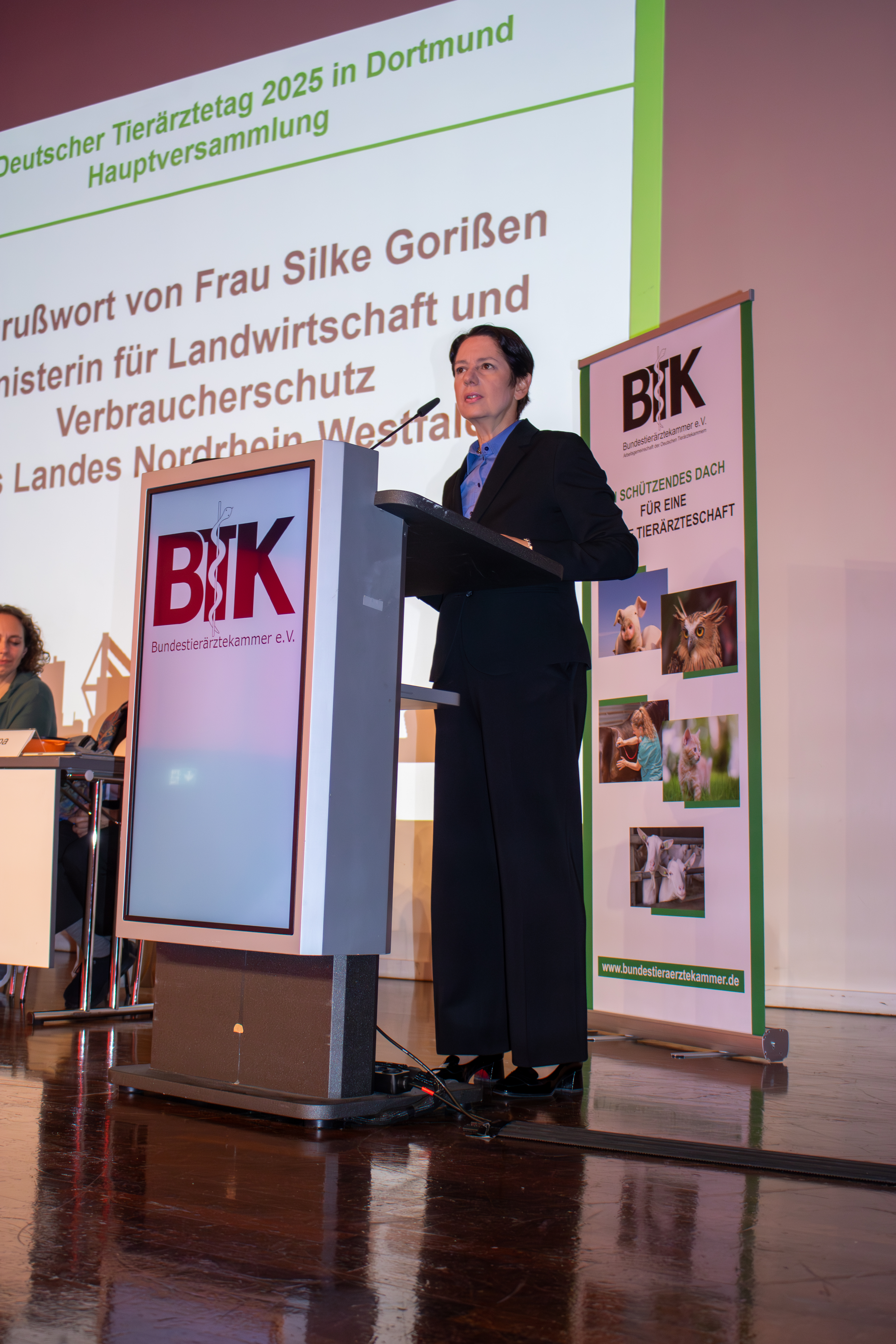 Die Ministerin für Landwirtschaft und Verbraucherschutz des Landes Nordrhein-Westfalen, Silke Gorißen, war vor Ort und wandte sich mit einem Grußwort an die Tierärzt:innen: „Mein Dank gilt allen Veterinärinnen und Veterinären für ihren unermüdlichen Einsatz für die Tiergesundheit und den Tierschutz, ob in der Praxis, den Behörden oder auch der Wissenschaft und Forschung. Ihre tagtägliche Expertise und Ihr Engagement für das Tierwohl sind beeindruckend.“ Weitere persönliche Grußworte überbrachten aus dem Bundesministerium für Landwirtschaft, Ernährung und Heimat (BMLEH) Staatssekretär Prof. Dr. Dr. Markus Schick und der Leiter der Abteilung 3 „Lebensmittelsicherheit, Tiergesundheit“, Prof. Dr. Eberhard Haunhorst.